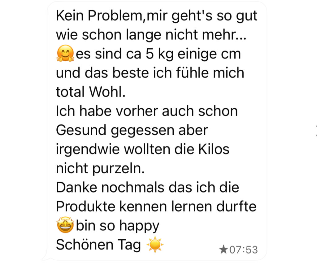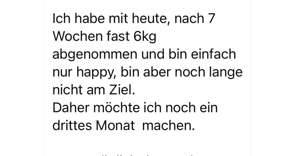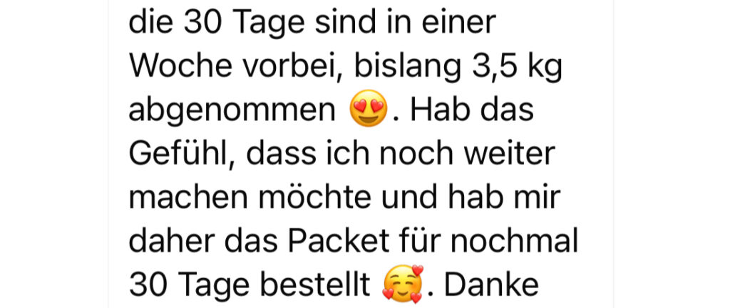 die 30 Tage sind in einer Woche vorbei, bislang 3,5 kg abgenommen 😍. Hab das Gefühl, dass ich noch weiter machen möchte und hab mir daher das Packet für nochmal 30 Tage bestellt 🥰. Danke 💕