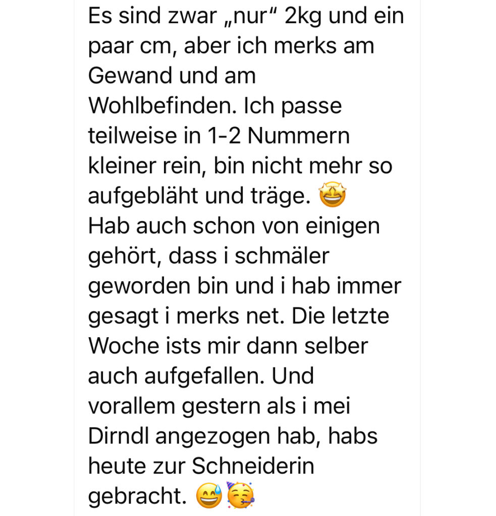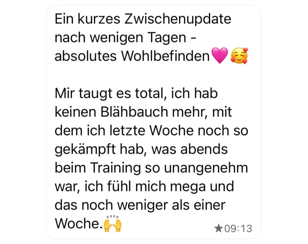 Mir taugt es total, ich hab keinen Blähbauch mehr, mit dem ich letzte Woche noch so gekämpft hab, was abends beim Training so unangenehm war, ich fühl mich mega und das noch weniger als einer Woche. 🙌