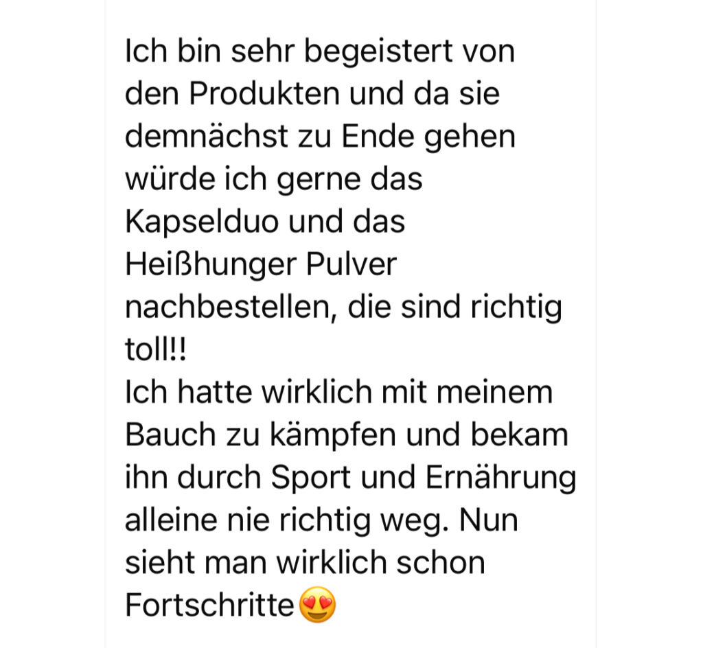 Ich bin sehr begeistert von den Produkten und da sie demnächst zu Ende gehen würde ich gerne das Kapselduo und das Heißhunger Pulver nachbestellen, die sind richtig toll!! Ich hatte wirklich mit meinem Bauch zu kämpfen und bekam ihn durch Sport und Ernährung alleine nie richtig weg. Nun sieht man wirklich schon Fortschritte 🥰