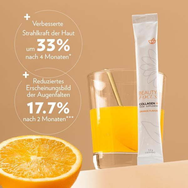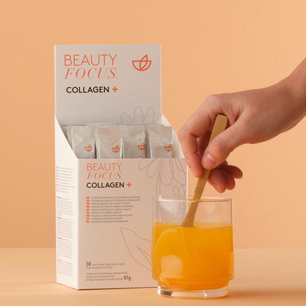 Beauty Focus Collagen+ ist ein Beauty-Nahrungsergänzungsmittel (Nutrikosmetik) mit sachkundig ausgewählten Inhaltsstoffen, die nachgewiesene Anti-Aging-Vorteile bieten. Jeder Beutel unseres Collagen+ enthält Kollagenhydrolysat und Weizenkeimextrakt. Ein weiterer Inhaltsstoff ist Lutein. Beauty Focus Collagen+ unterstützt nachweislich verschiedene wichtige Bereiche der Hautschönheit. Es trägt dazu bei, die Elastizität der Haut zu erhalten, ihre Strahlkraft positiv zu beeinflussen, ihre normale Struktur zu bewahren und nach 4 Monaten der Anwendung Fältchen im Augenbereich zu mildern.